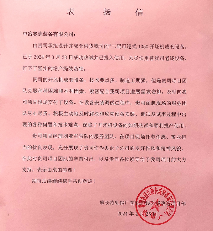 4月25日,一封來(lái)自攀鋼集團(tuán)江油長(zhǎng)城特殊鋼有限公司的表?yè)P(yáng)信,言辭懇切對(duì)中冶賽迪裝備在初軋產(chǎn)線二輥可逆式1350開(kāi)坯機(jī)升級(jí)改造項(xiàng)目中作出的突出貢獻(xiàn)及項(xiàng)目團(tuán)隊(duì)的優(yōu)異表現(xiàn)給予高度肯定。